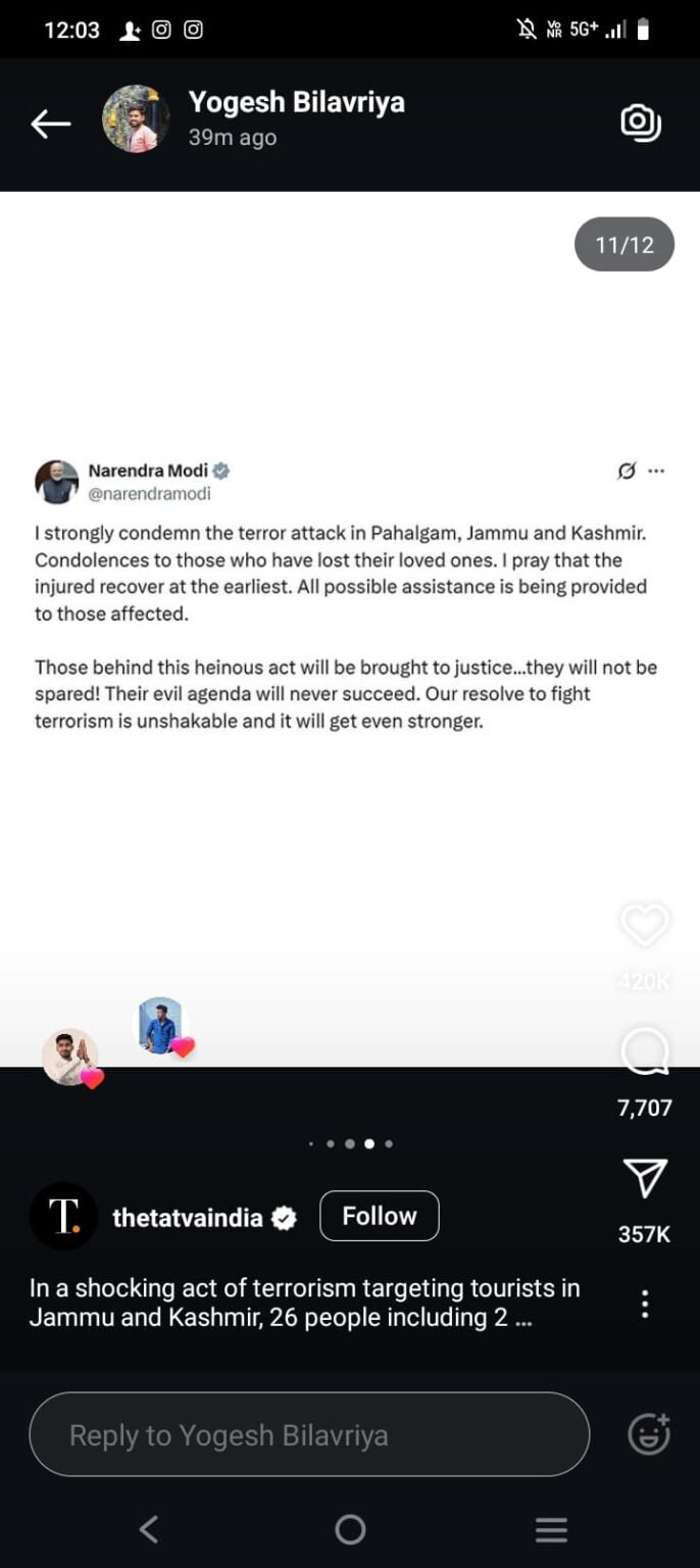 प्रधानमंत्री का बयान: “मैं जम्मू-कश्मीर के पहलगाम में हुए आतंकवादी हमले की कड़ी निंदा करता हूं। जिन परिवारों ने अपने प्रियजनों को खोया है, उनके प्रति मेरी गहरी संवेदनाएं हैं। घायल लोगों के शीघ्र स्वस्थ होने की प्रार्थना करता हूं। प्रभावितों को हरसंभव सहायता दी जा रही है। इस घृणित हमले के पीछे जो भी हैं, उन्हें न्याय के कठघरे में लाया जाएगा उन्हें बख्शा नहीं जाएगा। उनका नापाक मंसूबा कभी सफल नहीं होगा। आतंक के खिलाफ हमारी लड़ाई अडिग है और अब और भी कठोर होगी।”