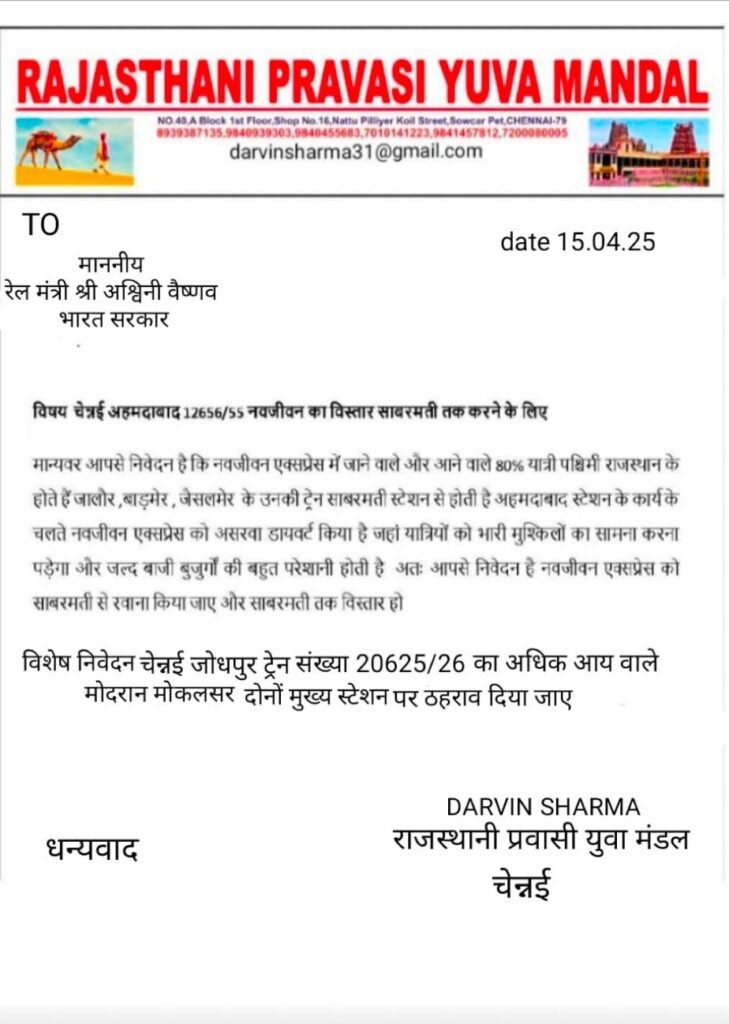 राजस्थानी प्रवासी युवा मंडल ने रेल मंत्री श्री अश्विनी वैष्णव को भेजे गए पत्र में चेन्नई-अहमदाबाद नवजीवन एक्सप्रेस (गाड़ी संख्या 12656/55) को साबरमती तक विस्तारित करने का निवेदन किया है। संगठन का कहना है कि इस ट्रेन में यात्रा करने वाले 80% से अधिक यात्री पश्चिमी राजस्थान जैसे जालौर, बाड़मेर, जैसलमेर, जोधपुर आदि क्षेत्रों से होते हैं।
