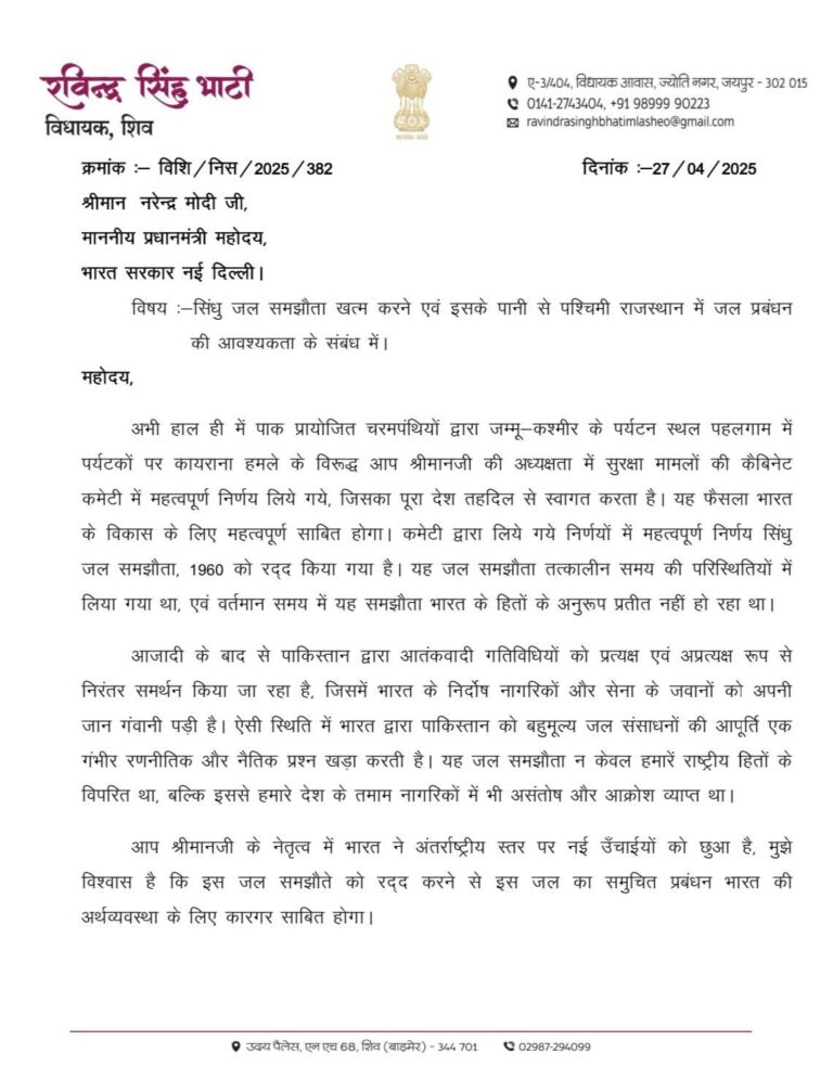 राजस्थान के शिव विधानसभा क्षेत्र से विधायक रविन्द्र सिंह भाटी ने 27 अप्रैल 2025 को प्रधानमंत्री नरेन्द्र मोदी को पत्र लिखकर सिंधु जल समझौते को समाप्त कर पश्चिमी राजस्थान में जल प्रबंधन की दिशा में ठोस कदम उठाने की मांग की है। उन्होंने पत्र में हाल ही में सरकार द्वारा सिंधु जल समझौते को रद्द करने के फैसले का स्वागत करते हुए इसे भारत की सुरक्षा और सामरिक नीति के अनुरूप बताया।